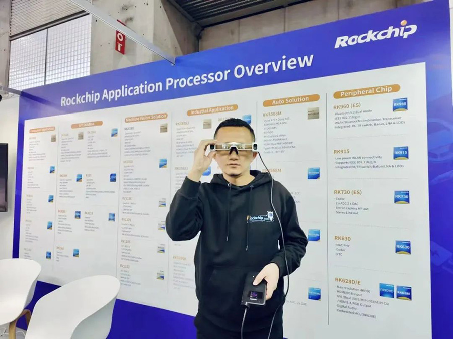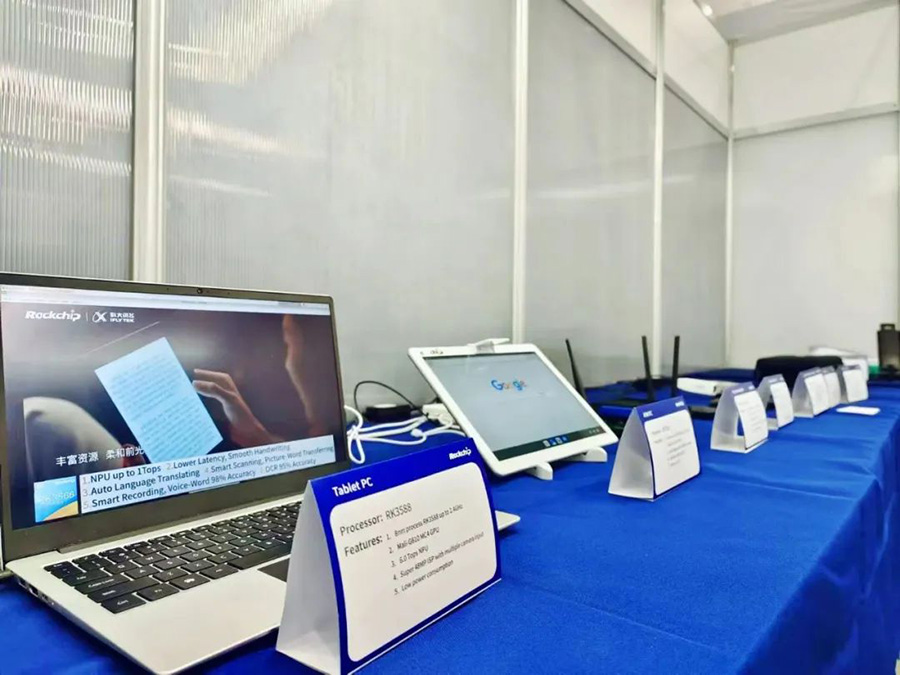 现场展出了系列搭载新一代AIoT旗舰芯RK3588的产品包括AR、游戏盒子、高端平板、Arm PC、边缘计算盒子等应用,海外用户对RK3588的强大的算力及8K显示性能有更直观的体验。