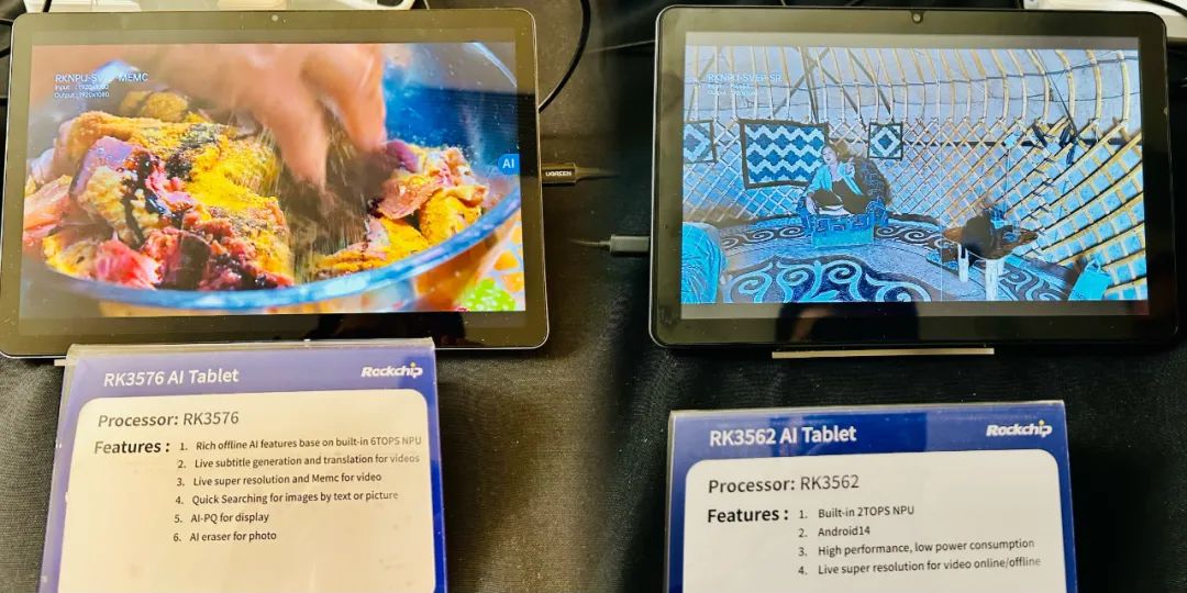 在消费电子展区,展出了多款AI平板,分别采用RK3588S、RK3576、RK3562,支持AI-PQ/MEMC/SR及实时字幕展示和翻译。RK3588S AI平板是目前国内极为热门的智能教育产品,集学习机、平板电脑及PC三合一,内置有道AI助手 "Hi Echo" ,对教育模式产生颠覆式影响,大大提高教学效果及学习效率。