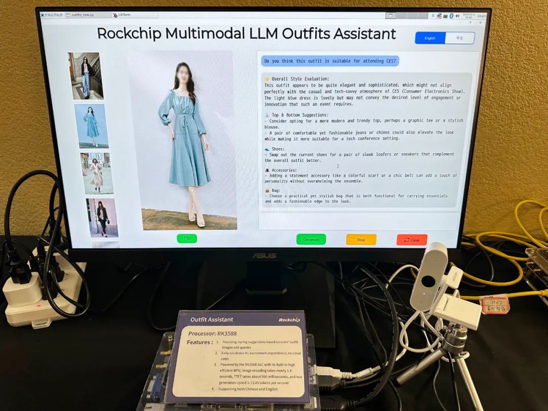 AI算法展区展示的是最新推出的基于RK3588的智能助手及穿衣助理。智能助手利用端侧运行的LLM模型,可以解答各类问询,提供检索增强技术模块,可以通过添加不同的产品文档秒变各类产品专家;集成了ASR和TTS算法,让用户可以与其进行语音对话;并支持数字人技术,体验沉浸式交互。穿衣助理是基于一个本地运行的多模态大模型,它可以根据用户上传的照片或信息,快速分析用户的风格偏好,并提供多种穿搭组合;响应迅速,实时提出建议,可应用在智能家居及个人助手智能设备领域。