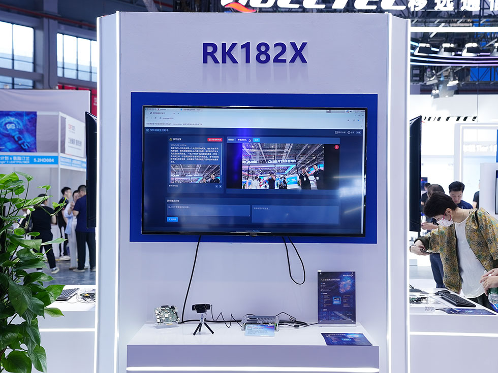 基于RK3588+RK182X的离线端侧大模型部署,支持最高7B大模型部署,在端侧设备上可实现包括视频分析摘要、识图助手、多模态感知等热门功能;展会上重点演示了端侧视频摘要功能,视频在端侧完成分析,实现安防秒级预警和摘要查询,实时性高,且不依赖网络,保护隐私,稳定可靠,适用于工业AOI检测、智慧安防、智慧城市、智慧园区的升级。